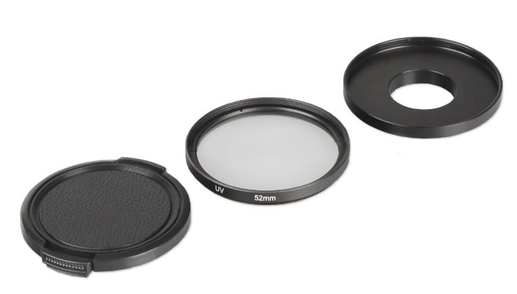 Zestaw ochronny składający się z adaptera filtrowy na 52mm, filtru UV 52mm, dekielka 52mm do kamer GoPro Hero 3.